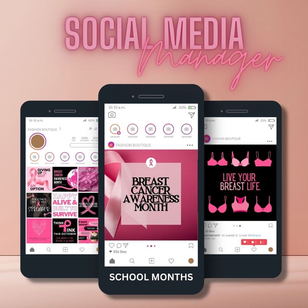 Breast Cancer Instagram Bundle Templates, Social Media Posts, Holidays, 75 Editable Canva Templates (25 jpegs, 25 pdf, 25 canva files)